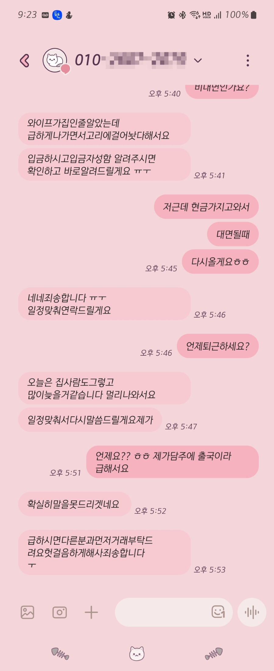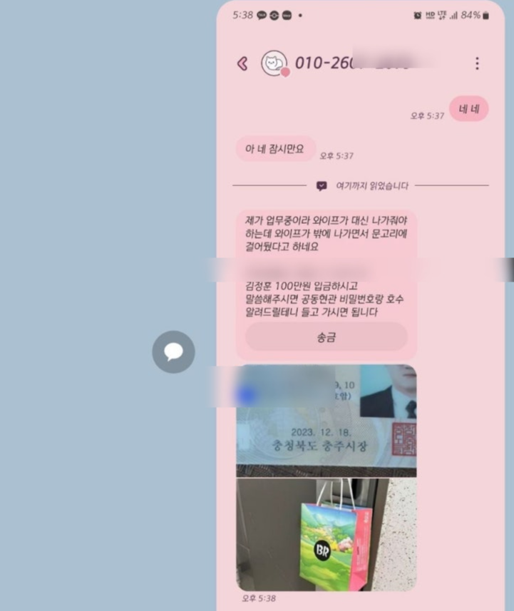 업무중이라~ 와이프가 문에 걸어뒀고~ 돈을 입금하면 알려주겠다. 사실 저때만해도 입금 할 생각 / 1000원이라도 넣을까 생각했었는데 아무리봐도 쎄한거임. 누가 요구하지도 않은 민증을 보여주며.. 약속해놓고 연락을 왜 먼저 주지 않았으며, 100만원이나 큰 거액의 돈거래인데 문에 돈을 걸어뒀다? 그래서 일단 친구한테 전화해서 사기같다고 이야기 하고 거래는 다행스럽게 진행되지 않았다. 저 짧은 시간동안 사기인지에 대해 여기저기 물어봤는데 요즘 유행하는 사기수법이라고 이미 올라온 포스팅이 있었다.
